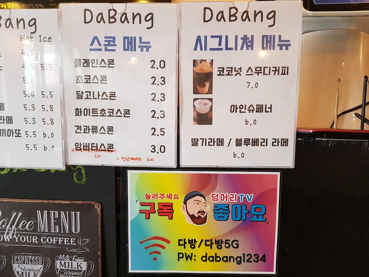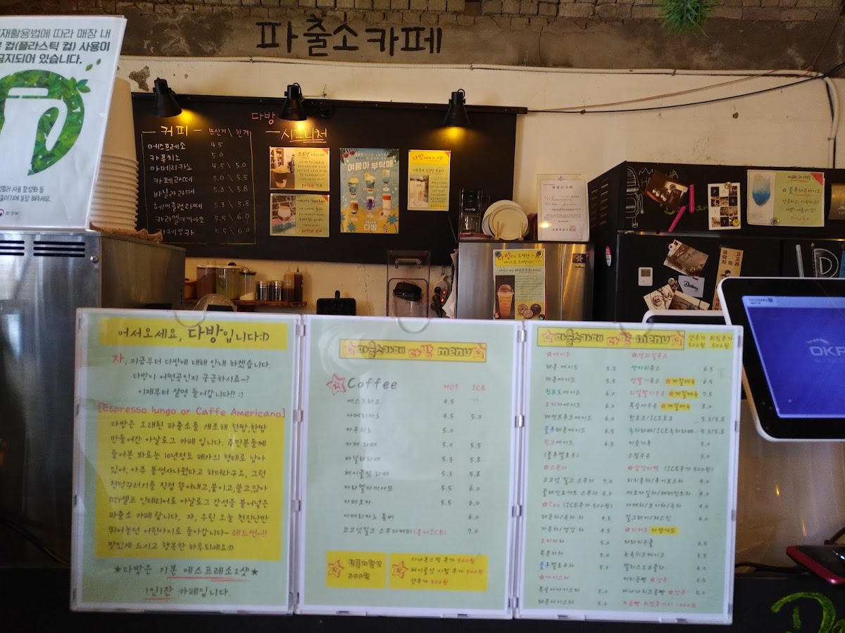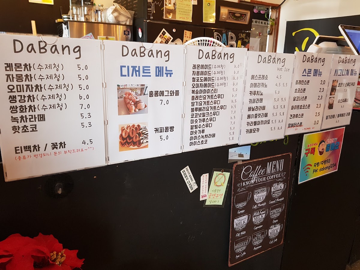 The menu at Dabang, a cafe located in Sejong-si, offers a variety of food and beverage options suitable for casual visits throughout the day. The selection primarily includes coffee and espresso-based drinks such as iced Americano and Cafe Mocha variations. In addition to coffee, the menu features a range of refreshing non-coffee beverages like grapefruit ade and peach milk.